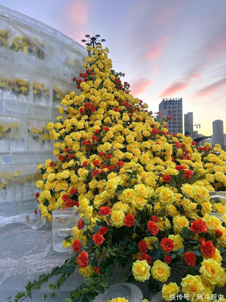 2023年冬季,哈尔滨的冰封红玫瑰曾火爆出圈,本年的冬季这一冰雪景不雅再度升级,当地打造了一个“冰封黄玫瑰”景不雅。