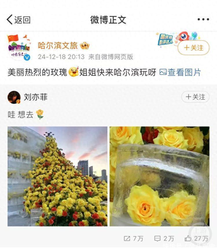 12月18日晚7时许,《玫瑰的故事》主演、演员刘亦菲在微博上发文:“哇,念念去,并配上黄玫瑰的面容和图片。”一小时后,哈尔滨文旅官方账号转发她的微博并发出邀请。