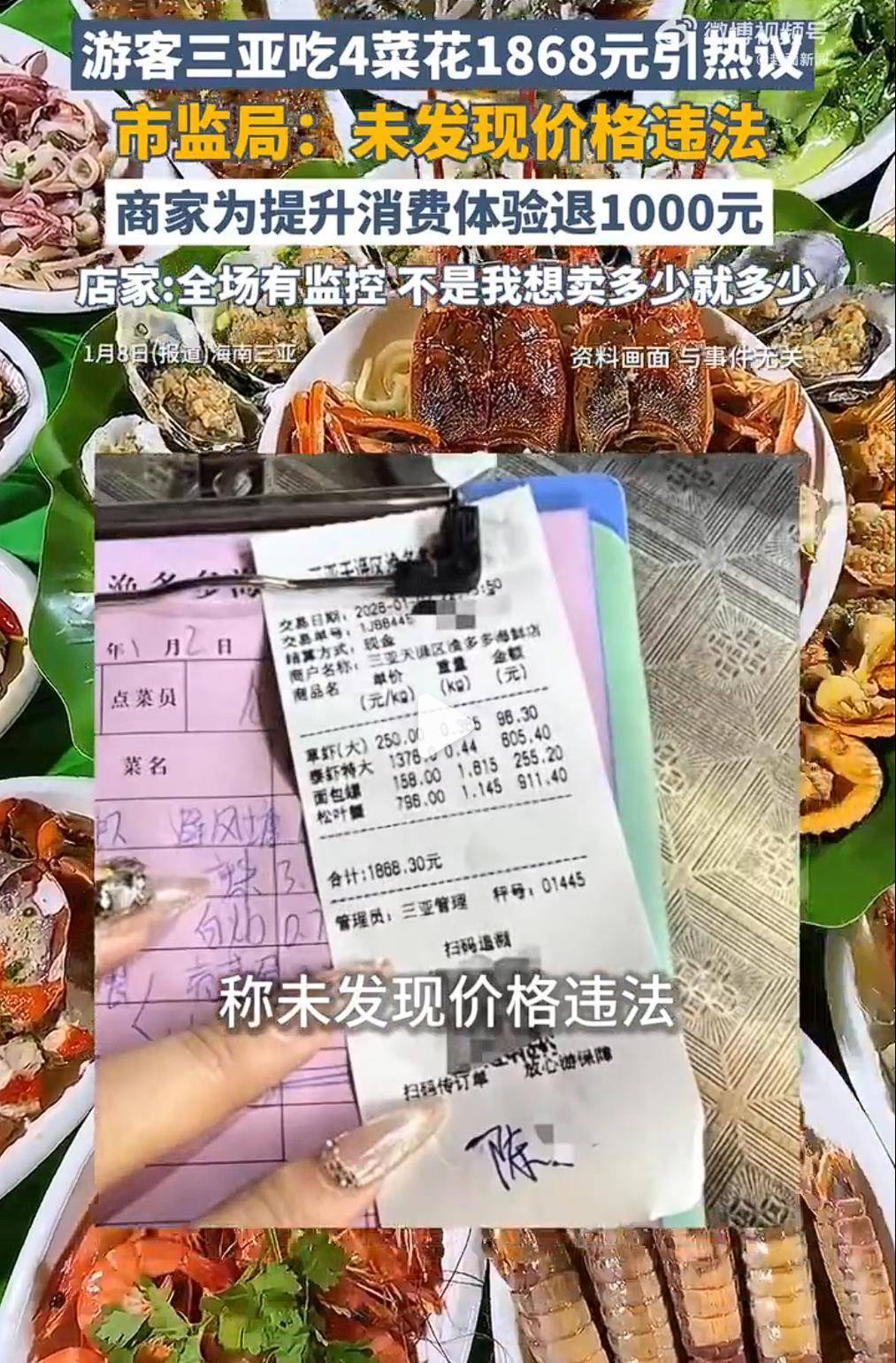 近日,安徽的陈女士发帖称,与家东说念主在三亚旅游时,被非运营车辆拉到海鲜店吃饭,4说念海鲜与2个椰子共消费1930元。其中,4说念海鲜价钱为1868元。点菜时,行状员强调“统共三亚齐是这个价钱,没钱就不要来吃海鲜”。