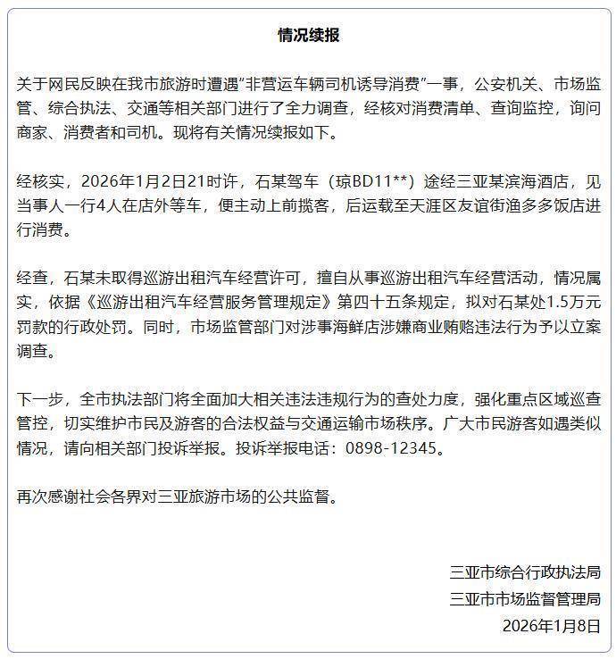 1月7日,三亚市商场监督不休局发布情况通报,称已连合交通等关系部门介入探望,如查实存在犯科违章活动,将照章从严办理,毫不姑息。