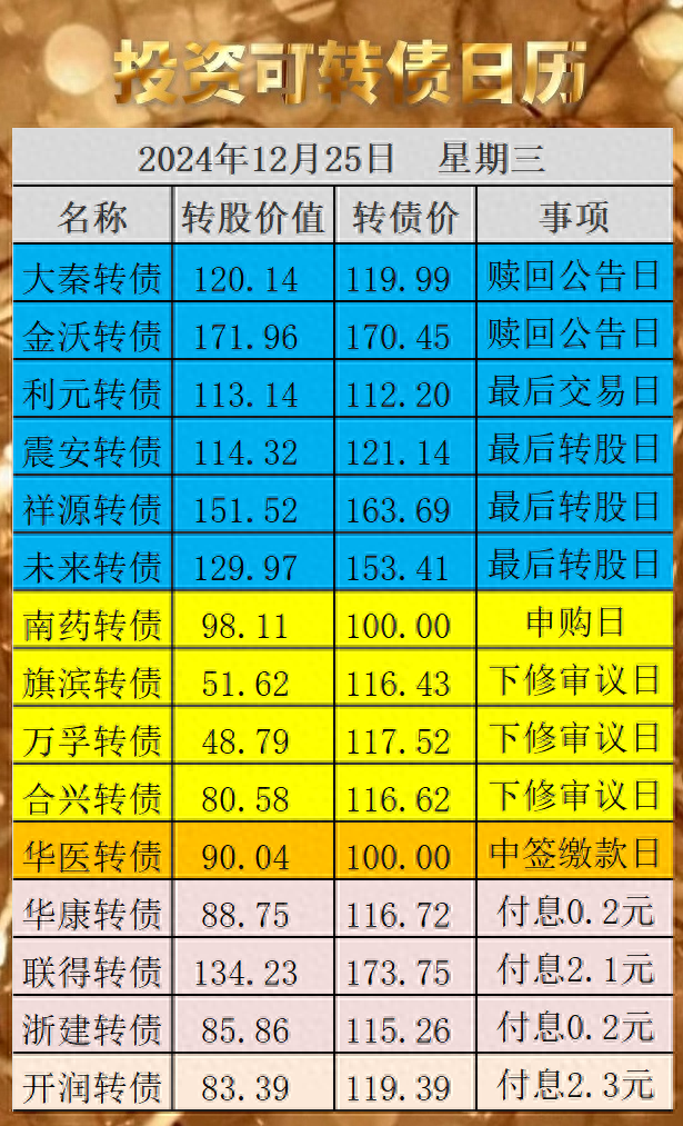 25日为震安转债、祥源转债、将来转债临了转股日,若是投资者健忘转股操作,将被101.43元、100.19元、102.93元赎回,分离亏蚀10%、30%、-20%以上。