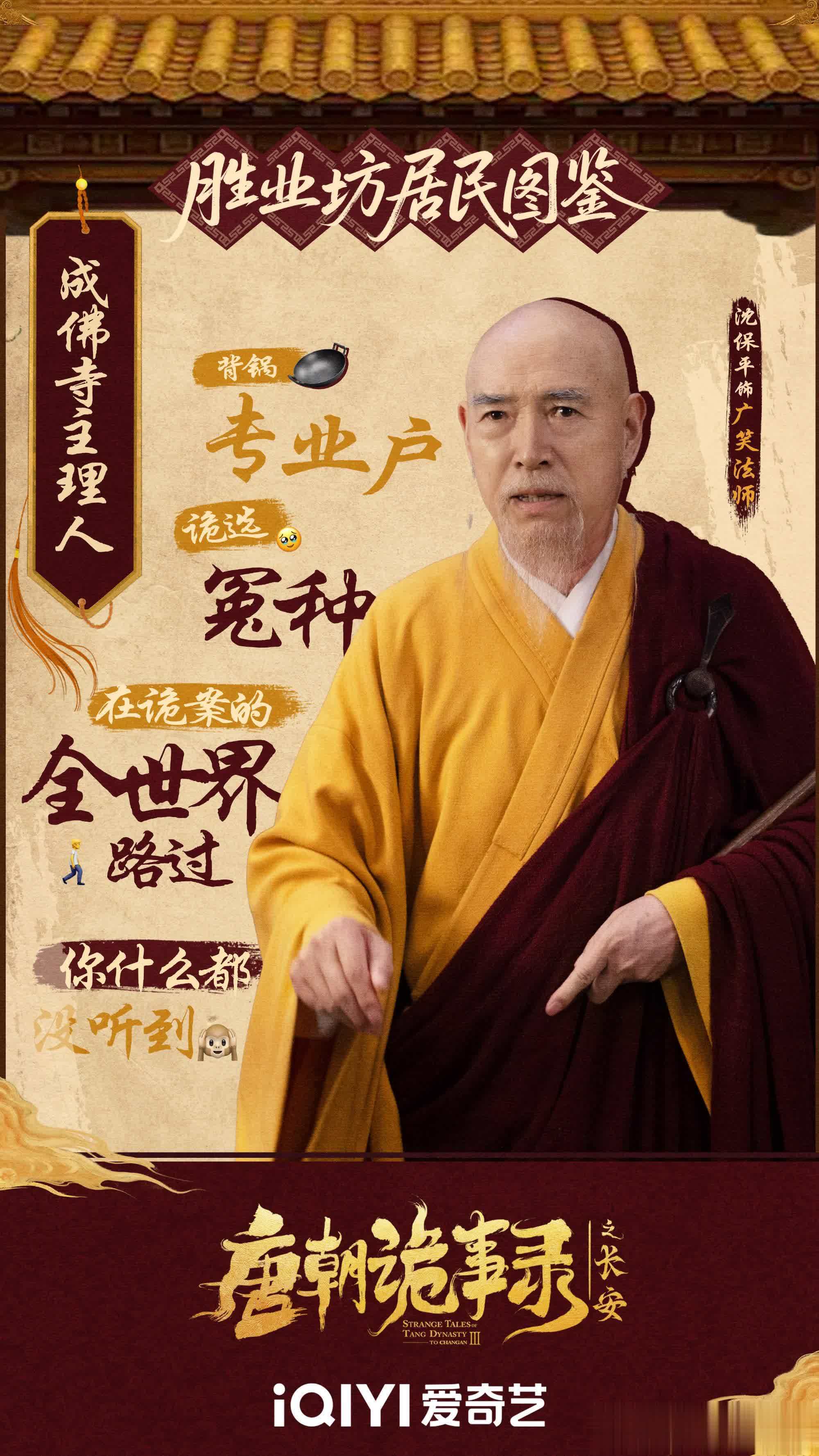 5、沈保平饰广笑沈保平扮演广笑法师,是《唐诡2》在“降魔变”中出场,因为不雅众猜不中凶犯于是立地冤枉一个,成为投凶榜常驻,弹幕常驻,即使《唐诡2》西行不在长安了,弹幕也还猜是广笑干的。