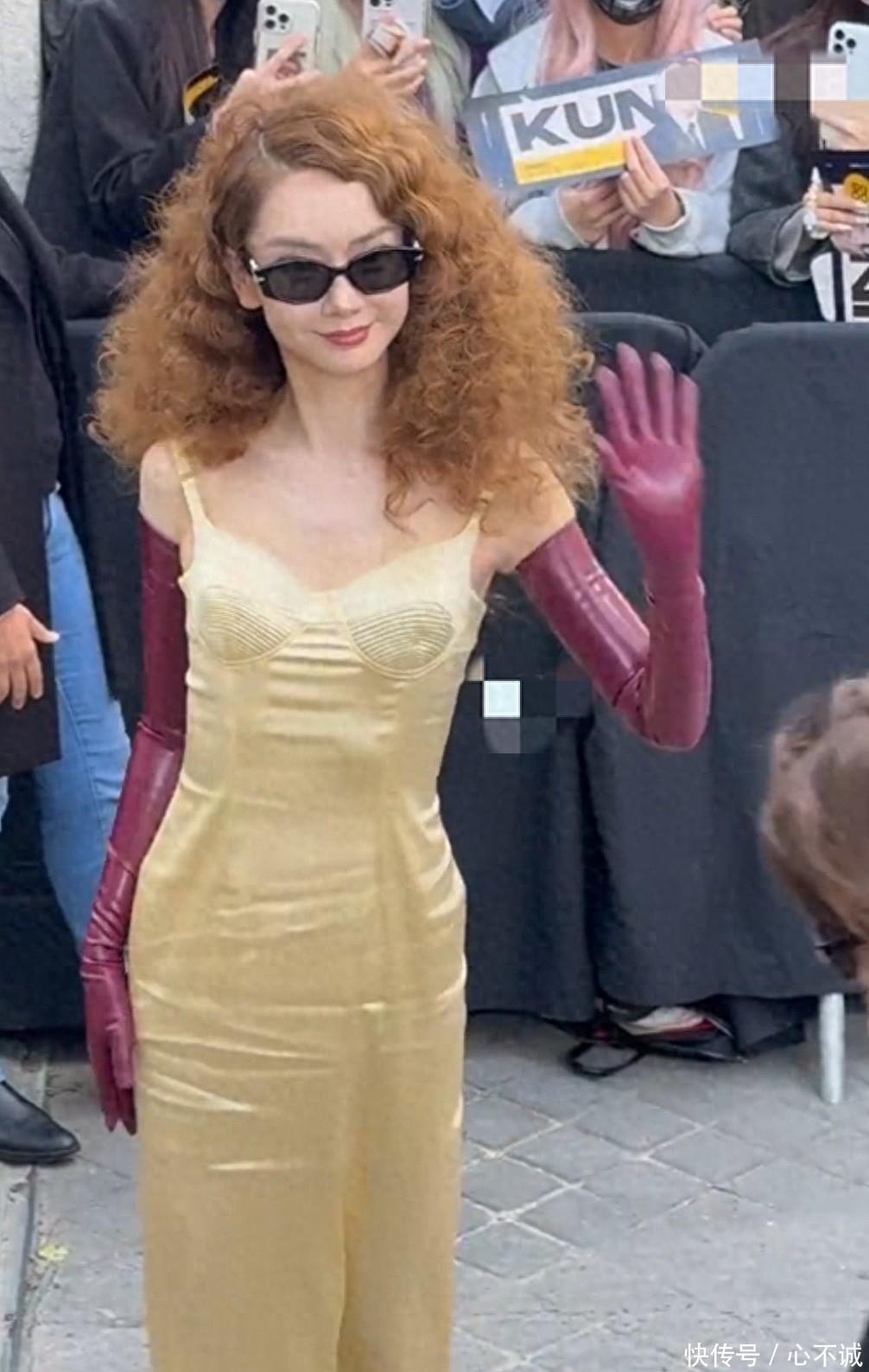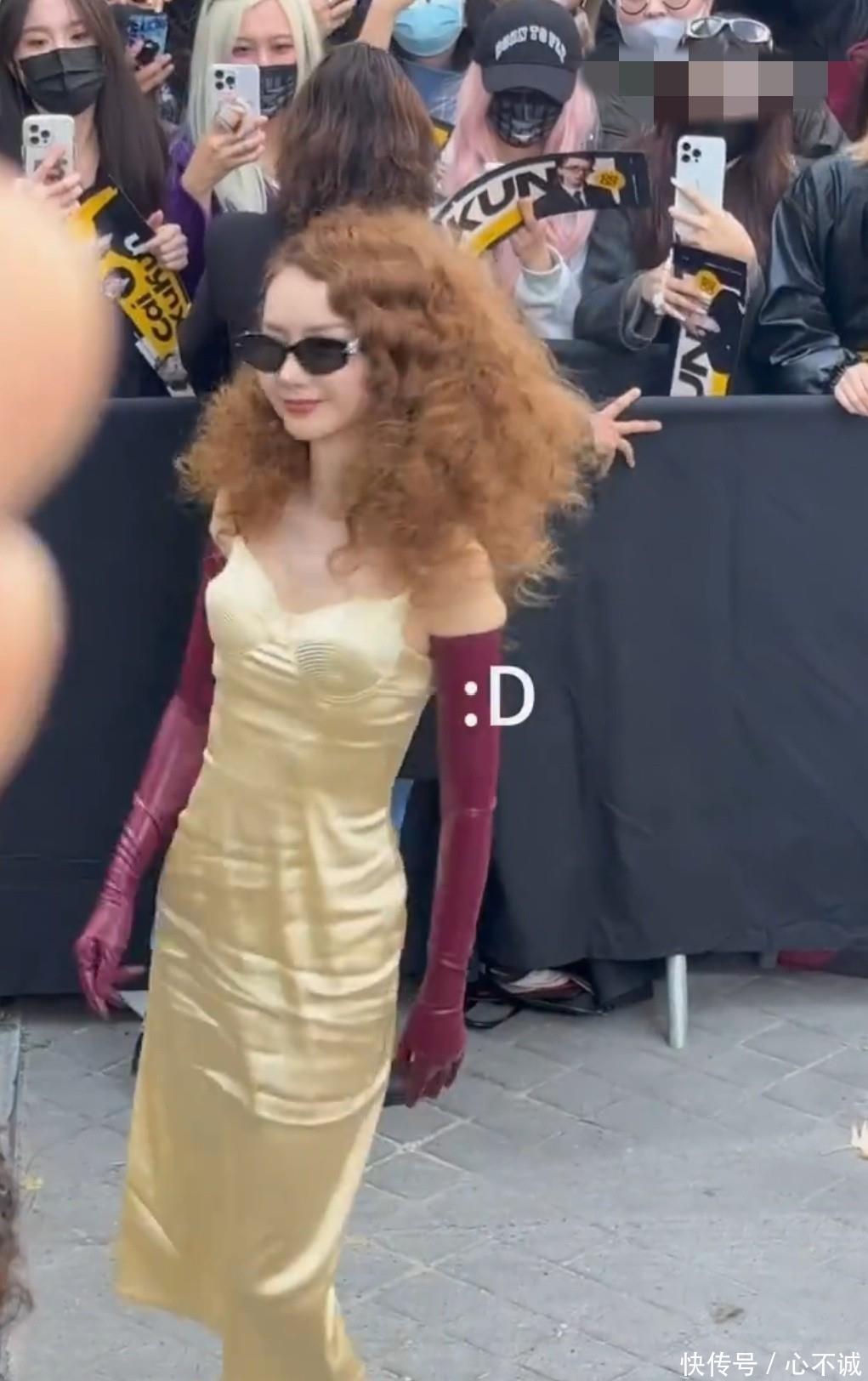 当戚薇身着这套造型出现时巴黎时装周秀场进口时,现场的镁光灯瞬息聚焦在她身上。濒临密集的镜头,戚薇莫得涓滴敛迹,她昂首挺胸,措施幽闲,金色的长发在微风中轻轻捷动,亮黄色的长裙在东谈主群中终点显眼,每一步皆展现出庞大的气场。