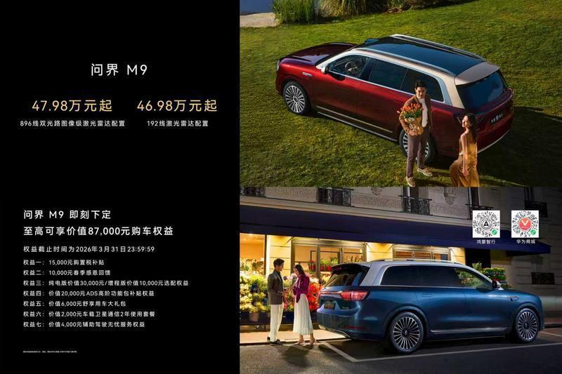 搭载新一代激光雷达的尊界S800和问界M9本日开启预定,尊界S800提议零卖价72.8万元起,即面前定,可享1.5万元购置税补贴,居品选配金职权、ADS高阶包救济等多重职权。问界M9提议零卖价47.98万元起,即面前定,可享1.5万元购置税补贴,居品选配金职权、ADS高阶包补贴等多重职权。